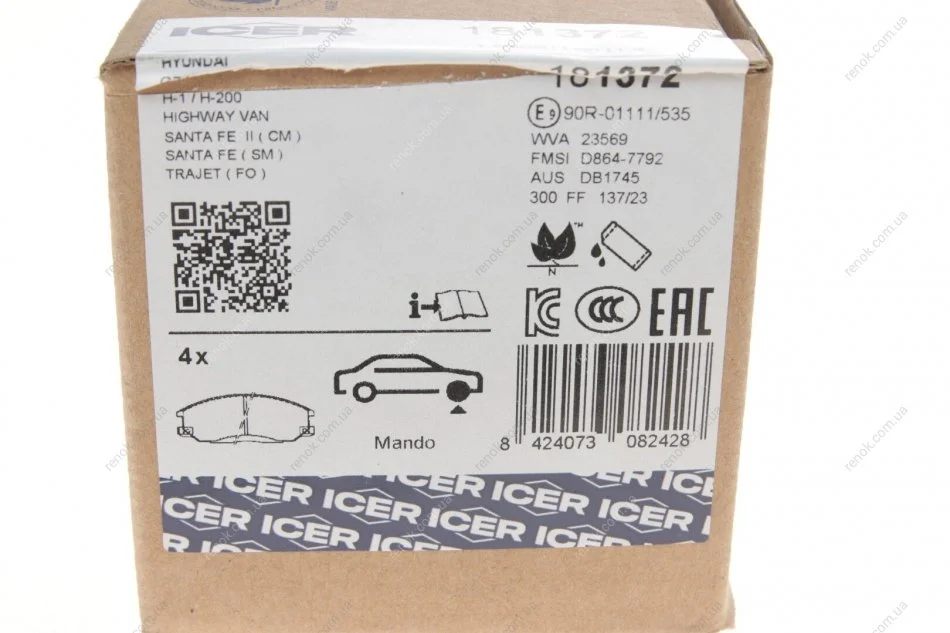Колодки тормозные (передние) Hyundai Santa Fe/Trajet 00-12/Ssangyong Actyon/Kyron 05-/Rexton 02- ICER 181372 (48130091A0, 5810126A00, 5810126A10)