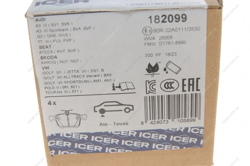 Колодки тормозные (задние) Audi A3/VW Golf 12-/Touran/Passat B8 14-/Skoda Karoq 17-/Octavia 20- ICER 182099 (5Q0698451C, 8V0698451, 8V0698451B)