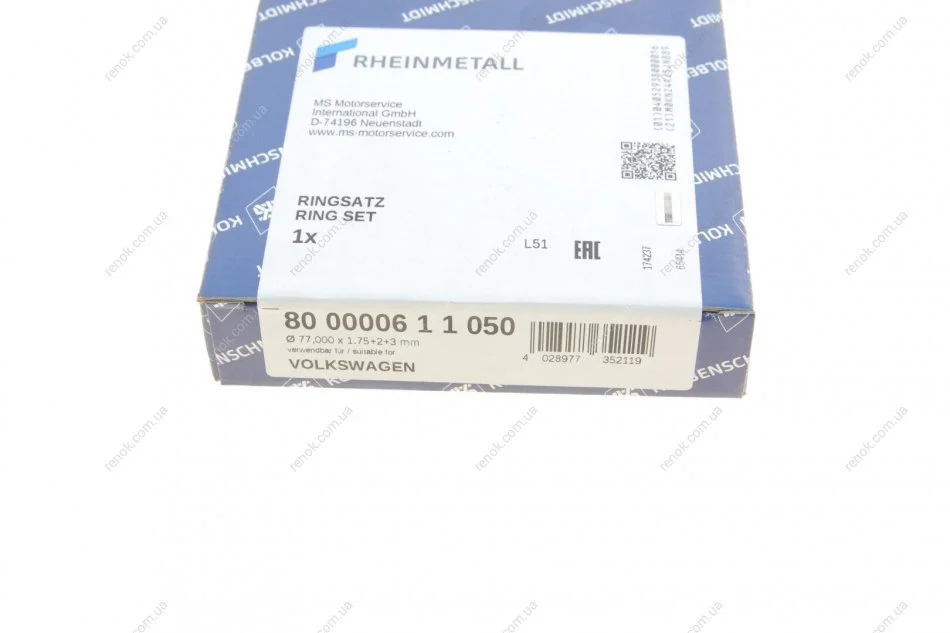 Кольца поршневые VW T3 1.6D 81-87 (77.00mm/+0.5) (1.75-2-3) (1 cyl) KOLBENSCHMIDT 800000611050 (068107305, 068198155A, 069107315)