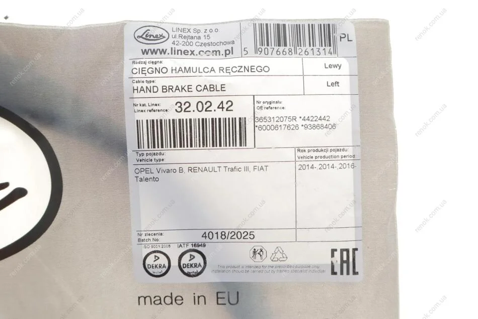 Трос ручного гальма LINEX 32.02.42 (93868406, 6000617626, 4422442)