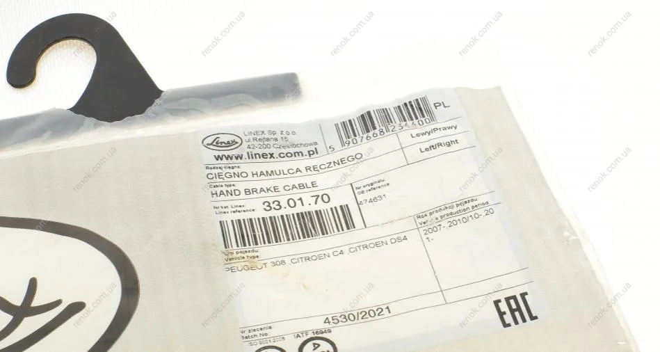 Трос ручника Peugeot 308 07- (2033/1188 мм) LINEX 33.01.70 (474631, 9659391180)