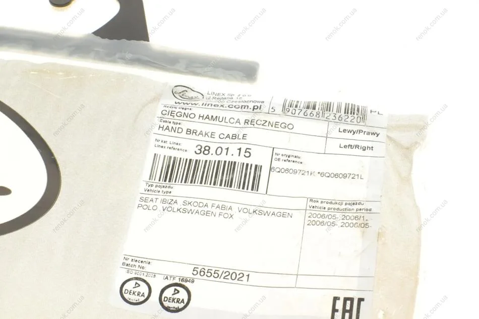 Трос ручника VW Polo 1.4/1.6 16V 01-09 (1645/1043 мм) LINEX 38.01.15 (6Q0609721L, 6Q0609721K)