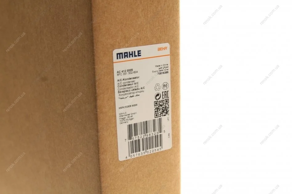 Радиатор кондиционера MH MAHLE / KNECHT AC 412 000S (0995002154, A0995001854, A0995002154)