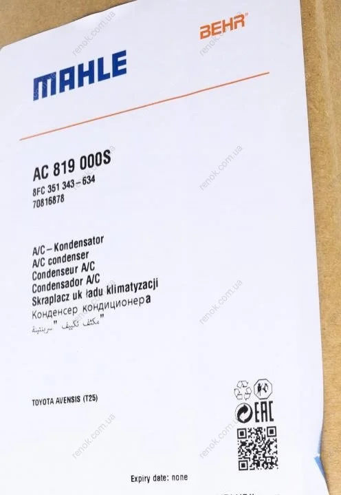 Радиатор кондиционера MAHLE MAHLE / KNECHT AC 819 000S (8845005170)