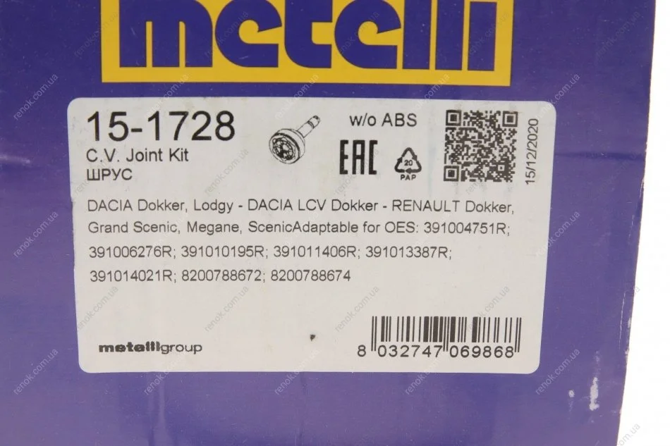 ШРКШ (наружный) Dacia Dokker/Lodgy 12-/Renault Megane/Scenic III 08- (25z/23z/52.5mm/82mm/54.9mm) Metelli 15-1728 (8200788672, 8200788674, 391001063R)