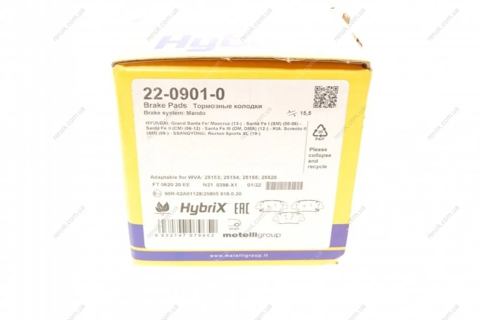 Колодки тормозные (задние) Hyundai Santa Fe II/III/IV 06-/Genesis/Kia Sorento II/III 09-/Stinger 17- Metelli 22-0901-0 (583020WA00, 583021UA50, 583022WA00)