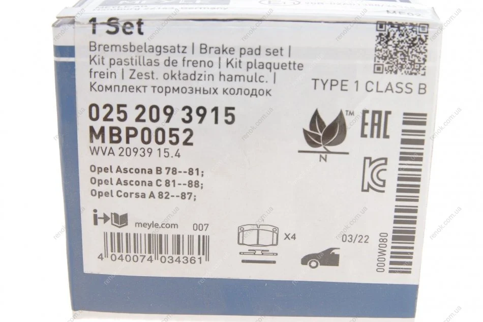 Тормозные колодки дисковые MEYLE 025 209 3915 (1605463, 1605485, 1605504)