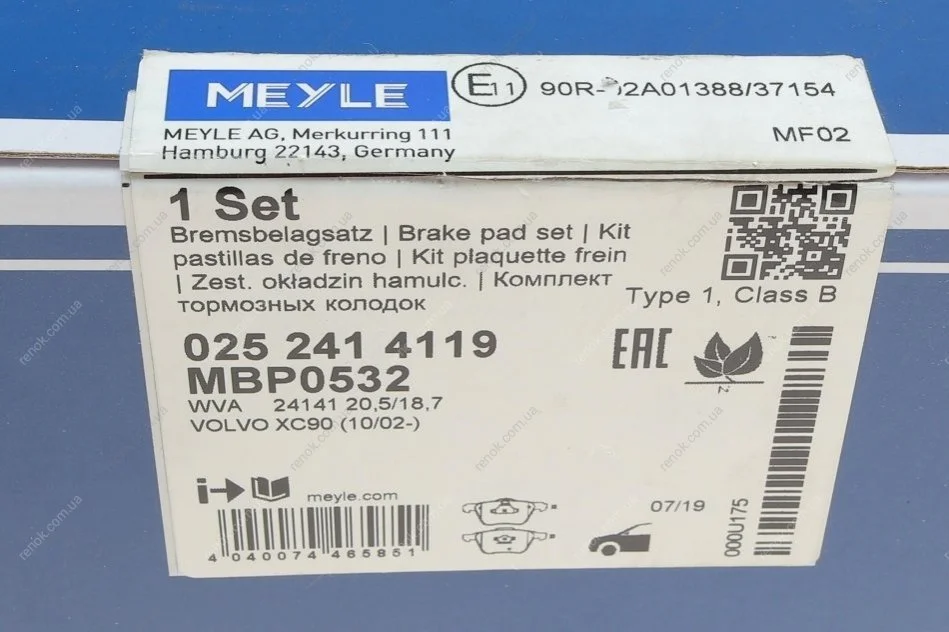 Колодки тормозные MEYLE 025 241 4119 (274331, 31262705, 30769125)