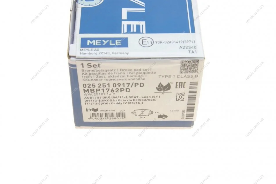 Колодки тормозные (задние) Audi Q3/Skoda Octavia/Seat Leon/VW Golf/Sharan 12-/Passat B8/Caddy IV 14- MEYLE 025 251 0917/PD (5Q0698451L, 5Q0698451B, 8U0698451F)