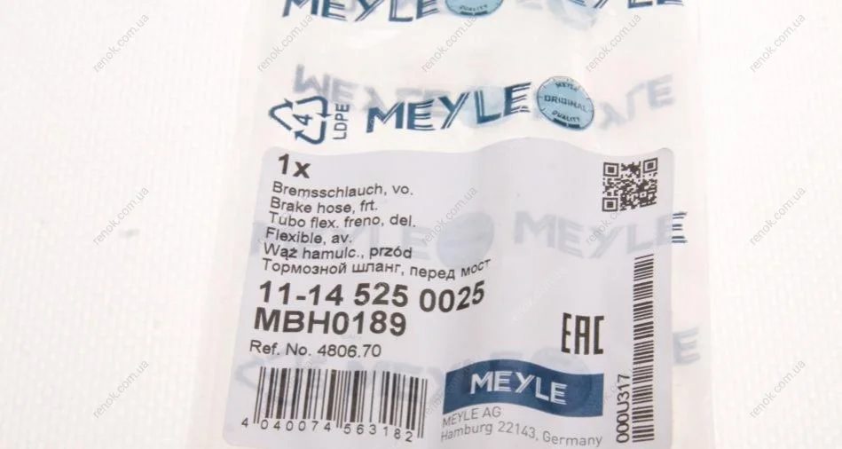 Шланг тормозной (передний) Fiat Ducato/Peugeot Boxer 94-02 (485mm) MEYLE 11-14 525 0025 (1311457080, 46786431, 480670)