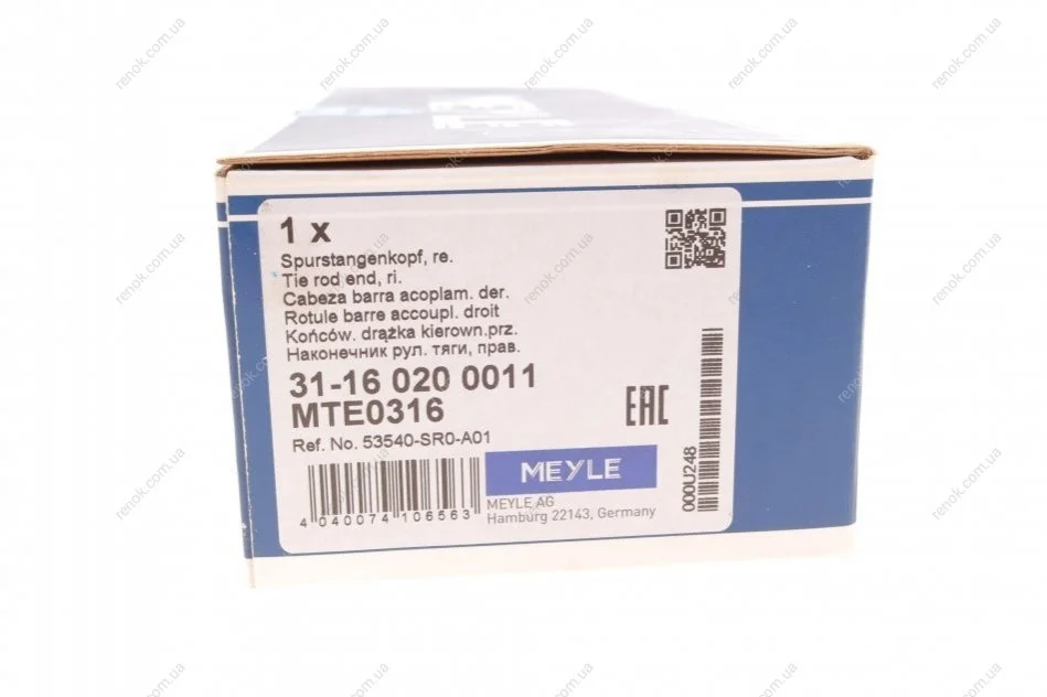Наконечник рулевой тяги (R) Honda Civic II/IV/V/VI 87-01/CR-V 95-02 MEYLE 31-16 020 0011 (53540S04003, 53540S04013, 53540SH0A01)