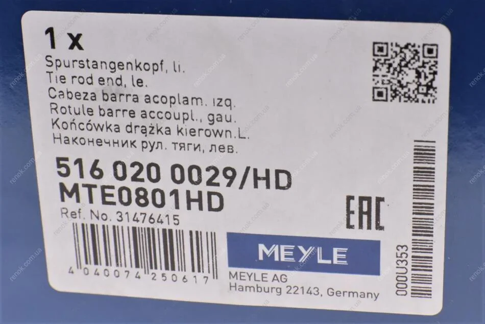 Наконечник рулевой тяги (L) Volvo V90 2.0 16-/XC60 2.0 17-/XC90 2.0 17- MEYLE 516 020 0029/HD (31476317, 31429235, 31476415)