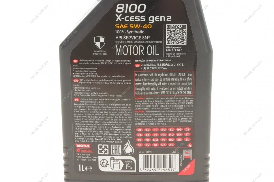 Масло 5W40 X-cess 8100 gen2 (1L) (VW 502 00/505 00/MB 229.5/LL-01/RN0710-0700/B71 2296) (109774) MOTUL 368201 gen2