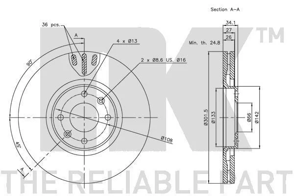 Диск гальмівний передній вентильований Citroen C4 PICASSO 2008-2014 NK 201938 (1606308280, 4246P5, 424933)