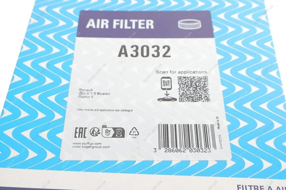 Фильтр воздушный Renault Captur 1.5dCi 20- (K9K) Purflux A3032 (165464PM0A)
