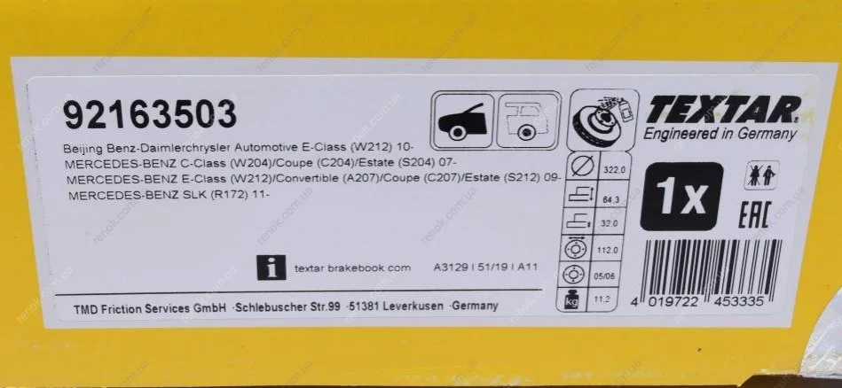 Диск тормозной (передний) MB C-class (W204) 07-/ E-class (W212) 09- (322x32) (заменено 92163505) TEXTAR 92163503 (000421121290, 0004211212, 000421121207)