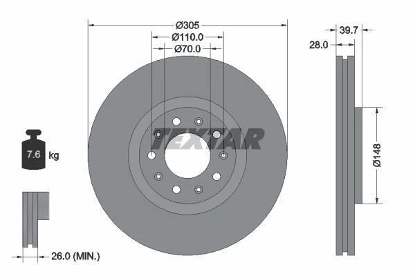 Диск гальмівний передн Лів/Прав ALFA ROMEO 159, BRERA, GIULIETTA, GIULIETTA/HATCHBACK, SPIDER CHRYSLER 200 FIAT 500X JEEP COMPASS, RENEGADE 1.3-3.2 06.05- TEXTAR 92220803 (51767382, 51767381, 68257206AA)