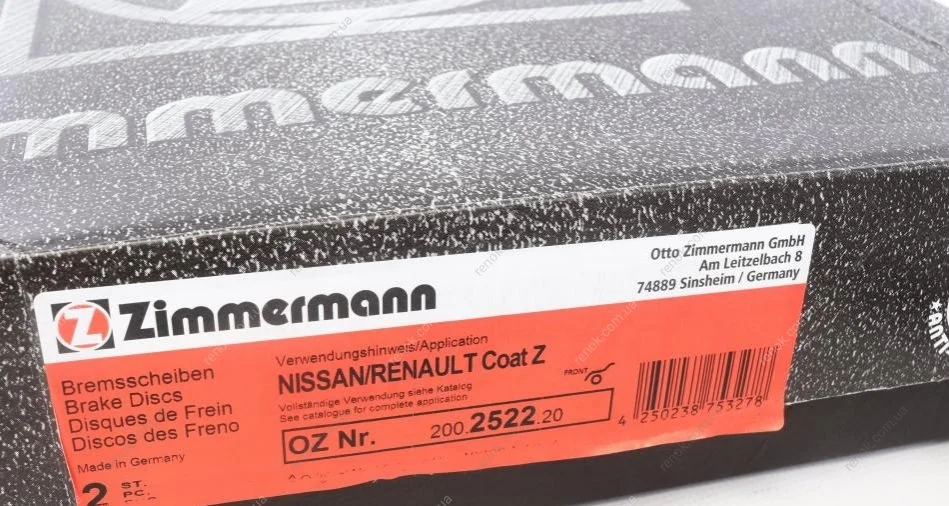 Диск тормозной (передний) Nissan Juke 13-/Qashqai 07-13/Renault Koleos 08- (320x28) (с покр) (вент.) ZIMMERMANN 200.2522.20 (40206ET01A, 402069828R, 40206JY01A)
