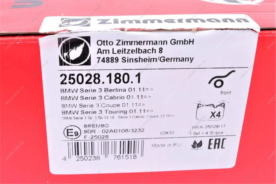 Колодки тормозные (передние) BMW 1 (F20/F21)/ 3 (F30/F31/F34)/ i8 (I12) 11- (Brembo) ZIMMERMANN 25028.180.1 (34116799805, 34116850850, 34116859066)